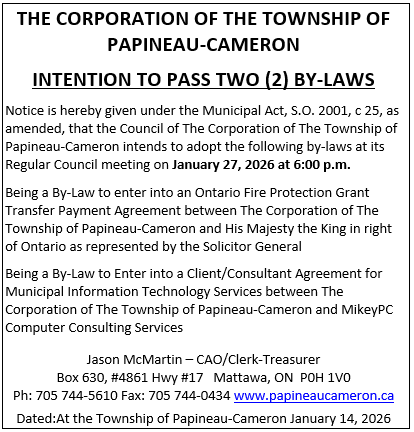 INTENTION TO PASS TWO (2) BY-LAWS admin2026-01-14T10:47:16-05:00January 14th, 2026| Related Posts REQUEST FOR PROPOSAL FOR INSURANCE RENEWAL REQUEST FOR PROPOSAL FOR INSURANCE RENEWAL January 21st, 2026 | 0 Comments RECYCLING CONTACT RECYCLING CONTACT January 2nd, 2026 | 0 Comments INTENTION TO PASS FOUR (4) BY-LAWS INTENTION TO PASS FOUR (4) BY-LAWS December 22nd, 2025 | 0 Comments LOW WATER ADVISORY – LEVEL 1 CONDITION LOW WATER ADVISORY – LEVEL 1 CONDITION December 15th, 2025 | 0 Comments HOLIDAY OFFICE HOURS 2025-2026 HOLIDAY OFFICE HOURS 2025-2026 December 15th, 2025 | 0 Comments
