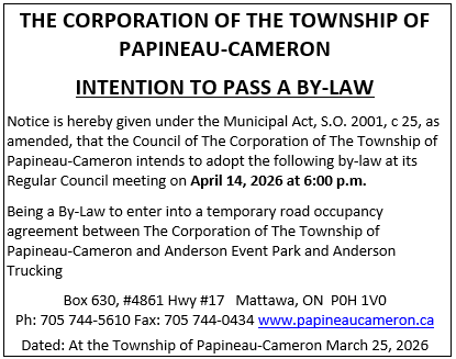 INTENTION TO PASS A BY-LAW admin2026-03-25T14:03:01-05:00March 25th, 2026| Related Posts Flood Outlook & Water Safety Message Flood Outlook & Water Safety Message April 2nd, 2026 EASTER OFFICE HOURS EASTER OFFICE HOURS April 1st, 2026 NO DAYTIME BURNING – APRIL 1 – OCTOBER 31, 2026 NO DAYTIME BURNING – APRIL 1 – OCTOBER 31, 2026 April 1st, 2026 Notice of Nominations for Office Notice of Nominations for Office March 31st, 2026 Notice to Third Party Advertisers Notice to Third Party Advertisers March 31st, 2026