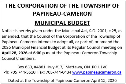 MUNICIPAL BUDGET admin2026-04-15T11:25:23-05:00April 15th, 2026| Related Posts INTENTION TO PASS A BY-LAW INTENTION TO PASS A BY-LAW April 15th, 2026 NBMCA – Flood Warning NBMCA – Flood Warning April 14th, 2026 Flood Outlook & Water Safety Message Flood Outlook & Water Safety Message April 2nd, 2026 EASTER OFFICE HOURS EASTER OFFICE HOURS April 1st, 2026 NO DAYTIME BURNING – APRIL 1 – OCTOBER 31, 2026 NO DAYTIME BURNING – APRIL 1 – OCTOBER 31, 2026 April 1st, 2026
